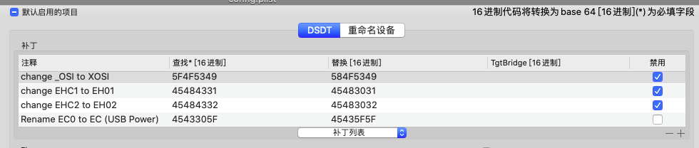 - 最后是,应用补丁,并保存到相应的目录里面。你可以用 Clover Configure 打开你的配置文件看一下,ACPI 配置那一栏的补丁,如下图所示是我的补丁情况: