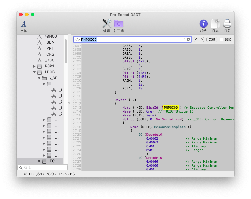 - 在该文件里面查找字符串 PNP0C09 ,然后看上面那个 Device 里面就是你的 EC 设备的真真名字了。不过,如果你有多个匹配项,那么包含 _HID _CRS 等的才是真真的设备。这是我打完补丁后重启的截图。