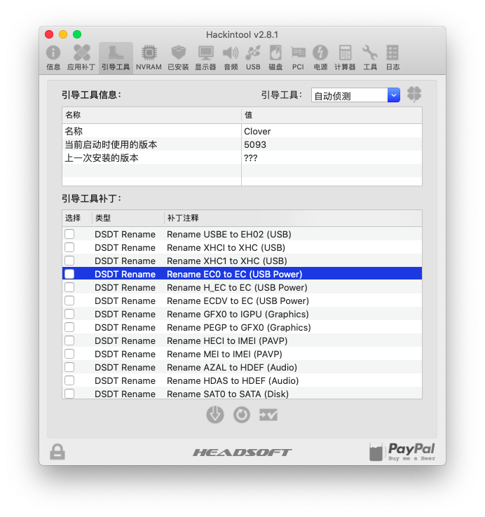 - 这一步就是使用 Hackintool 打补丁了,首先打开应用程序,到补丁菜单把应用补丁打上勾。然后到启动补丁那一栏,找到 DSDT Rename… 这里是要 EC 项,因此根据你刚才找到的名字来具体选择。