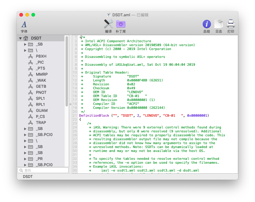 - 使用 MaciASL 编辑工具打开你刚才提取的原始 DSDT.aml 文件,通常位于 EFI/CLOVER/ACPI/origin 目录里面。