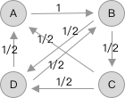 从图中可以看出 A 页面把唯一的链接给了 B ,而 B 页面同时链接了 D 和 C ,C 页面同时链接了 A 和 D,D 页面则同时链接了 B 和 A。 如果我们把每一个链接都打分,然后每一个页面链接出去的分数总和为 1 的话,就得到如下图所示: